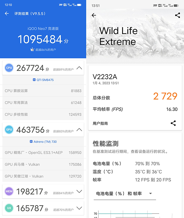 最近很多主打性能的手機(jī)都不約而同地選擇了去年口碑尚且不錯的旗艦芯片——第一代驍龍8+,iQOO Neo7競速版也是如此。不過iQOO Neo7競速版的第一代驍龍8+是滿血版,主頻最高達(dá)到了3.2GHz,另外增強(qiáng)版LPDDR5內(nèi)存以及超頻版UFS3.1閃存也沒有缺席。安兔兔成績達(dá)到1095484分,3DMark成績達(dá)到2729分,這個成績也基本是驍龍8+產(chǎn)品的主流跑分成績。