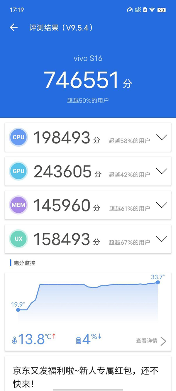 標準版的vivo S16采用了驍龍870處理器,這顆芯片的口碑有目共睹,性能強勁、功耗出色,在閑來之余,用vivo S16玩一局游戲也是不錯的放松。在最新版本的安兔兔中,vivo S16整體可以得到接近75萬分的成績,表現(xiàn)還不錯。