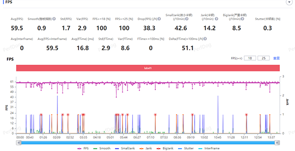 這里我使用兩款游戲進(jìn)行了測試。第一款是原神,60幀高畫質(zhì)測試,平均幀率達(dá)到了59.5幀。可以看出整個(gè)幀率線條非常平穩(wěn),而且測試完之后,手機(jī)的背部巨虎感受不到太明顯的發(fā)熱。