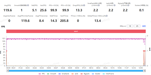 第二款測試的游戲是《王者榮耀》,開啟高幀率和高畫質(zhì)測試一局游戲,平均幀率為119.6幀,如果不是最后退出游戲界面導(dǎo)致幀率回調(diào),可以穩(wěn)穩(wěn)的維持在120幀滿幀。