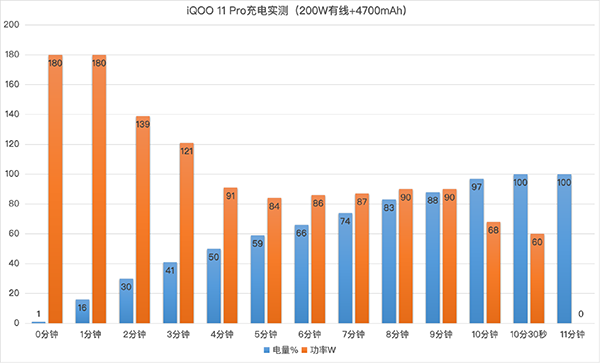 在iQOO 11 Pro充電測(cè)試中,速度快得幾乎肉眼可見(jiàn),甚至要用秒來(lái)記錄。借助Power-Z測(cè)得,在充電過(guò)程中,iQOO 11 Pro充電的前一分鐘能夠達(dá)到180W驚人的峰值功率,隨后維持在130-90W之間,當(dāng)電量達(dá)到了50%之上后,仍保持著80W左右的功率,直至UI顯示100%,此時(shí)功率仍在60W左右。
