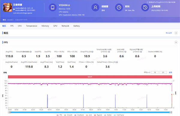 在兩局30多分鐘的排位賽中,iQOO 11的游戲幀數(shù)分別是120.1幀和119.8幀。整體游戲過(guò)程中都沒(méi)有呈現(xiàn)出太大的波動(dòng),只是最后獲勝出現(xiàn)動(dòng)畫的時(shí)候才會(huì)出現(xiàn)大幅度掉幀,不愧是王者榮耀KPL/KIC官方比賽用機(jī)。