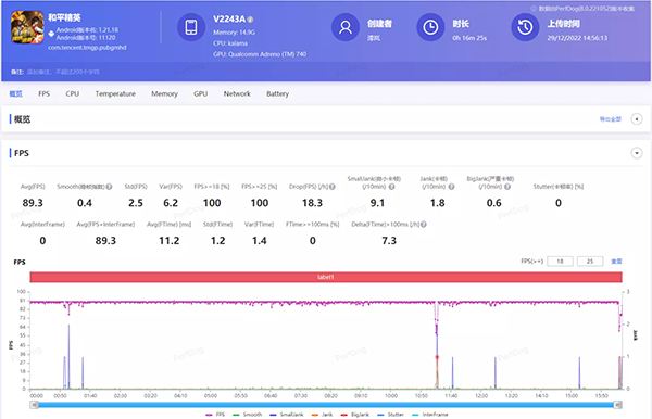 一局游戲下來(lái),幀數(shù)為89.3幀,整體波動(dòng)也比較低,除了成盒的一瞬間會(huì)出現(xiàn)頻率波動(dòng),其他情況都比較穩(wěn)定。