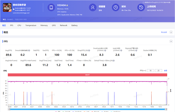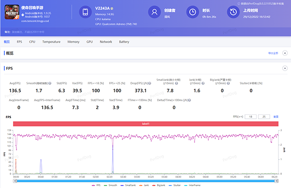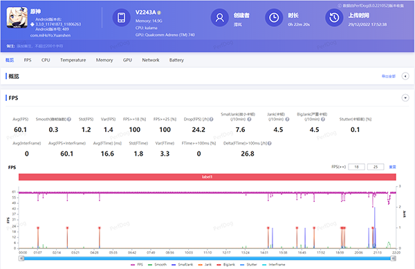 經(jīng)過(guò)22分鐘的跑圖+打野怪,iQOO 11可以說(shuō)完美征服了《原神》,整體游戲幀數(shù)達(dá)到了60.1幀,整體游戲體驗(yàn)自然也是酣暢淋漓。