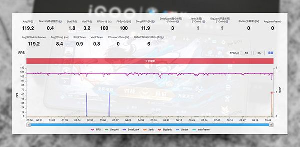 iQOO 11原生支持王者榮耀120幀,而且在vivo自研V2芯片加持下,可以優(yōu)化高幀率下的功耗,極致畫面模式下開了一局夢境大亂斗,10分鐘全程戰(zhàn)斗,平均幀率達到了119.2,畫面流暢穩(wěn)定,非常舒適。