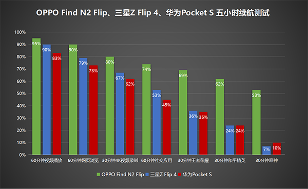 而為了測試OPPO Find N2 Flip的水平,我們也特別安排了5小時的重度續(xù)航測試內(nèi)容,并帶上三星Galaxy Z Flip4、華為Pocket S一同測試。