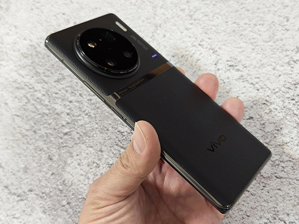 尤其是X90 Pro+的4個攝像頭置于一個“大圓環(huán)”中,攝像頭模組右側(cè)的從上到下依次是豎條和狀閃光燈、攝像頭規(guī)格文字標識以及蔡司logo。攝像頭下方的緞帶云階也可以說是X90 Pro+設(shè)計上的一個亮點,視覺上讓原本左置的圓形影像模組看起來均衡協(xié)調(diào)一些。緞帶云階上印有 Xtreme Imagination和vivo-ZEISS co-engineered 的字樣,陶瓷質(zhì)感的緞帶光刻工藝與機身的素皮形成明顯的對比。正常手持手機時,食指正好觸碰到云階,油潤的阻尼感和素皮的粗糙感交替,讓觸感更加豐富。X90 Pro+的這個緞帶云階設(shè)計,在觀感和觸感上都可謂是點睛之筆。