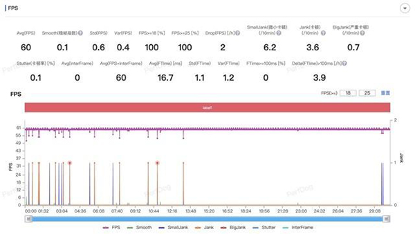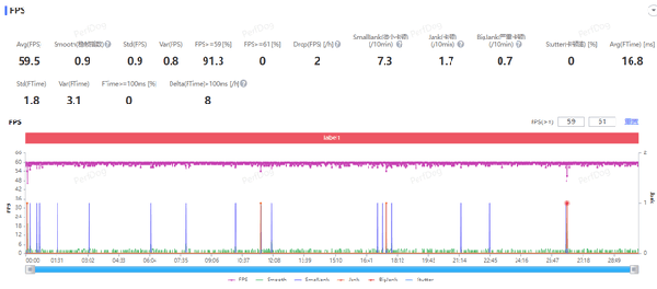 從實(shí)際游戲表現(xiàn)來(lái)看,iPhone 14 Pro跑30分鐘《原神》,平均幀率為59.5fps,91.3%的時(shí)間可以穩(wěn)定在59fps以上,整個(gè)游戲過(guò)程中,超過(guò)一幀的波動(dòng)很少,游戲全程還是非常穩(wěn)的。