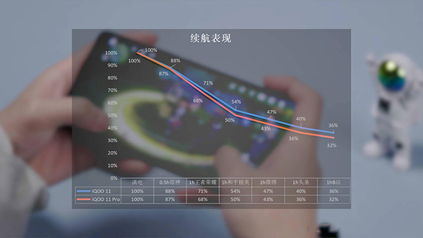 續(xù)航上因為iQOO 11電池容量更大,所以用的時間也更持久,經過5小時重度續(xù)航測試,iQOO 11還剩36%,Pro還剩32%,由于游戲部分是高幀率測試的,兩款手機續(xù)航表現讓大部分上班族們堅持到下班是完全足夠的。