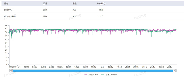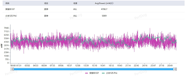 在30分鐘的《原神》測試中,榮耀80 GT平均幀率為59.2幀,總體體驗還是相當流暢的。值得一提的是,在30分鐘的《原神》測試中,榮耀80 GT平均功耗接近4.8W,這個成績還是相當優(yōu)秀的。這里我們拉出搭載了滿血版驍龍+的小米12S Pro進行對比: