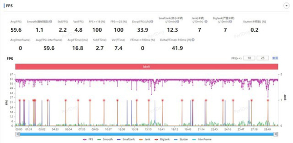 根據(jù)《原神》游戲的幀率圖來看,小米13的表現(xiàn)并不突出。小米13的峰值幀率雖然可以超越60幀,但是游戲的平均幀率僅為59.6幀,數(shù)據(jù)表示小米13很難讓幀數(shù)平穩(wěn)下來,與之前測試過的競品相比,它在《原神》游戲上流暢度的表現(xiàn)有些差強人意。