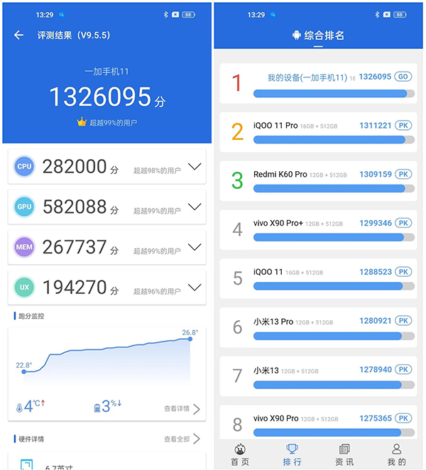 一加11的硬件配置對(duì)我來(lái)說(shuō)是頂尖的,打游戲絲毫不會(huì)卡頓。它搭配了滿(mǎn)血版驍龍8 Gen2、滿(mǎn)血版16GB大內(nèi)存和滿(mǎn)血版UFS 4.0閃存,手機(jī)剛到手我就跑了個(gè)分,大家覺(jué)得成績(jī)?cè)趺礃樱?