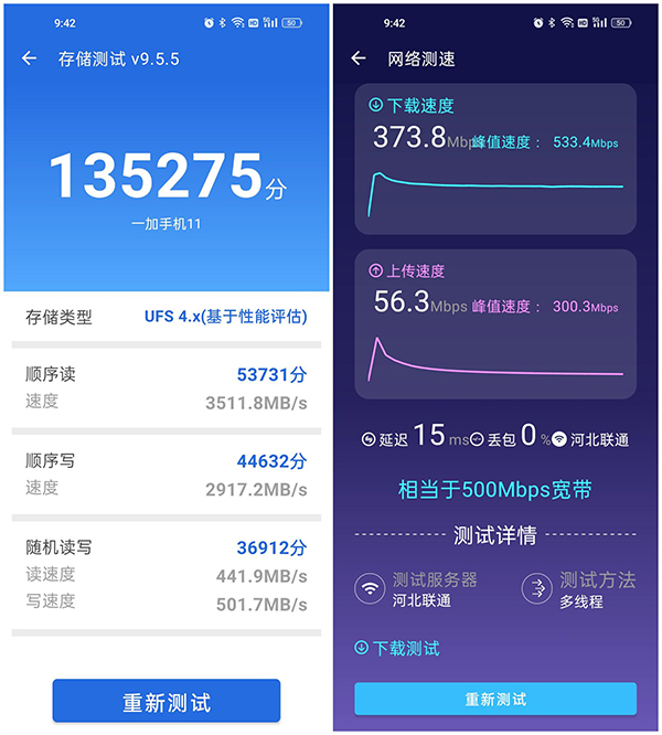 再看存儲(chǔ)和網(wǎng)速測(cè)試,給力不?一加11憑借性能三件套的強(qiáng)悍性能,安兔兔跑分很輕松超過(guò)132萬(wàn)分,這手機(jī)用三年不卡肯定是沒(méi)問(wèn)題的了。一加11的內(nèi)存配置的是LPDDR5X 8533Mbps,內(nèi)存帶寬也大幅度提升了,我實(shí)際測(cè)試后臺(tái)的應(yīng)用留存可以打開(kāi)40個(gè)APP,屬于性能溢出的水平。