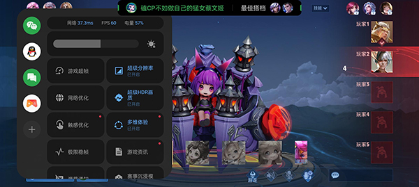 你看,排位選英雄的時(shí)候,屏幕最上方有最佳搭檔推薦,左上有網(wǎng)速、幀率、電量顯示,左下可以進(jìn)行超幀、穩(wěn)幀、調(diào)節(jié)畫質(zhì)等操作。