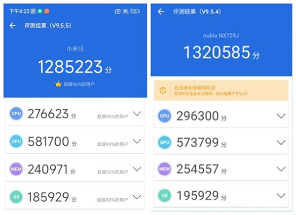 小米13和紅魔8 Pro+這兩臺(tái)手機(jī)均搭載驍龍8 Gen2處理器。新處理器的性能相比大家已經(jīng)有所了解,比前代的提升不是一星半點(diǎn)。在跑分方面,小米13獲得了1285223分,紅魔8 Pro+則是1320585分,顯然游戲手機(jī)比標(biāo)準(zhǔn)的旗艦手機(jī)在跑分能力上高出不少。
