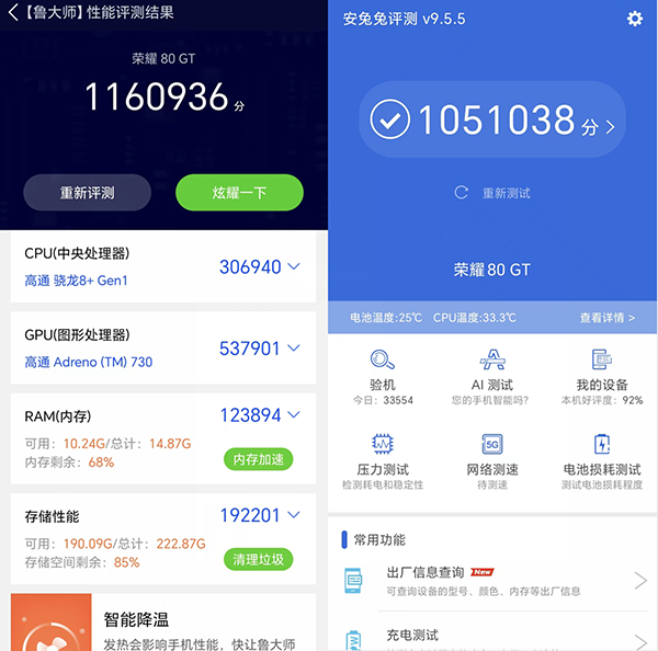 在實際的安兔兔跑分測試中,榮耀80 GT也是輕松跑出了105萬分的成績,魯大師跑分測試中則同樣也是輕松突破百萬大關,跑出了116萬分的成績,這樣的跑分測試成績足以證明榮耀80 GT的性能。