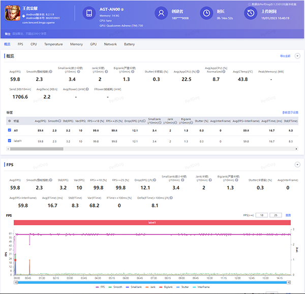 這里也是選取了《王者榮耀》作為游戲測試對象,在開啟最高幀率、最高畫質(zhì)的情況并開啟幀率增強的情況下下進行時長半小時的游戲。通過下方的游戲幀率測試圖可以清楚看到,一局游戲下來幀率波動并不大,并未出現(xiàn)卡頓、掉幀的情況,而且平均幀率更是達到了59.8幀,這里說明一下,在開啟獨顯增強后。雖然顯示幀率為60幀,但實際的幀率其實已經(jīng)通過插幀的方式提升至120幀。