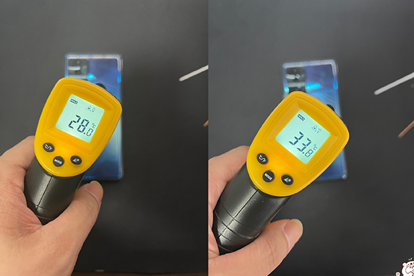 其次則是散熱表現(xiàn),在開始游戲測試前機身溫度是28度,而在結(jié)束半小時游戲測試后,機身溫度為33.8度,相比于測試之前溫度只上升了5.8度。而這樣的散熱效果放在同價位段中來說,絕對可以算的上是比較頂?shù)拇嬖凇?