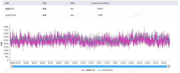 在30分鐘的《原神》測試中,榮耀80 GT平均幀率為59.2幀,總體體驗還是相當(dāng)流暢的。值得一提的是,在30分鐘的《原神》測試中,榮耀80 GT平均功耗接近4.8W,這個成績還是相當(dāng)優(yōu)秀的。這里我們拿出搭載了滿血版驍龍+的小米12SPro進(jìn)行對比:
