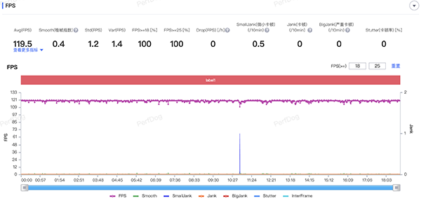 《王者榮耀》120幀率,最高畫質(zhì),實戰(zhàn)場景下,能跑出119.5幀的平均幀率,整個游戲過程中的幀率曲線基本上是一條直線,可以說是非常穩(wěn)了。