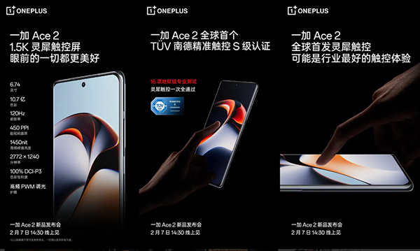 一加Ace2搭載一塊6.74英寸1.5K靈犀觸控屏,擁有10.7億色、120Hz刷新率、450PPI、1450nit局部峰值亮度、100%DCI-P3色彩飽和度、高頻PWM調(diào)光,帶來清晰明亮護(hù)眼體驗(yàn)。從這些配置信息來看,一加Ace2將是這一價(jià)位段的王炸級新機(jī)。