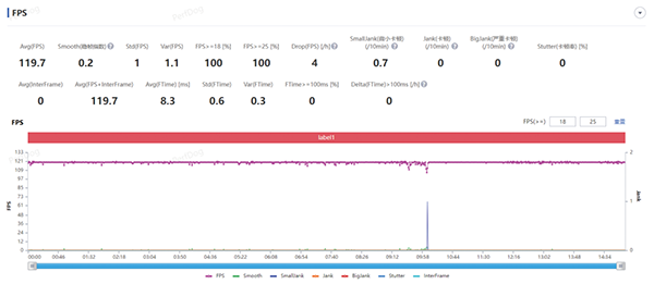 眾所周知,《王者榮耀》對(duì)硬件的要求并不算太高,但是在游戲幀率為極高、分辨率為超高、畫面總質(zhì)量為極致的設(shè)定下,大部分手機(jī)并不見得能“穩(wěn)住”幀率。而我們用PerfDog測(cè)得vivo X90 Pro+在一局時(shí)長(zhǎng)約15分鐘的游戲中,平均幀率為119.7fps,技能釋放順滑,十人團(tuán)戰(zhàn)也沒有出現(xiàn)明顯的幀率波動(dòng),整體表現(xiàn)可以用“滿分”二字總結(jié)。