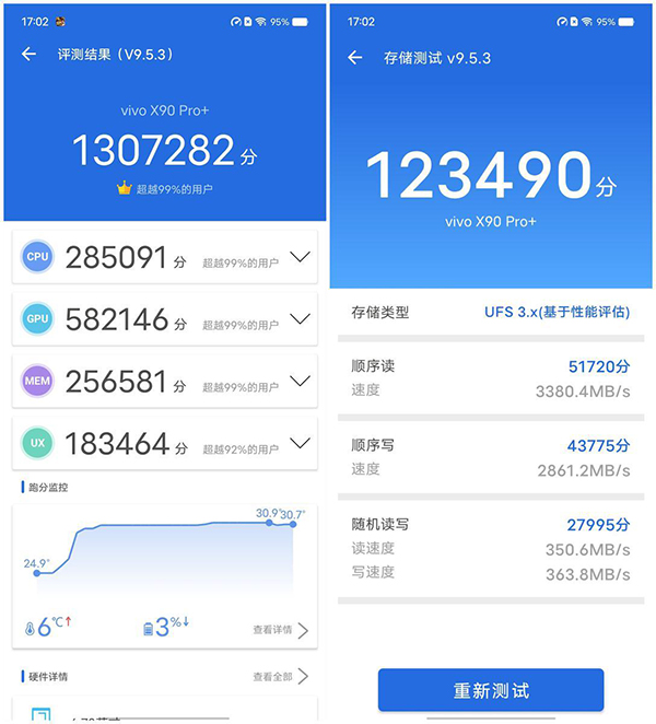 我們手中的這臺(tái)12GB+512GB版本的vvivo X90 Pro+的跑分成績(jī)?yōu)?307282分,CPU成績(jī)?yōu)?85091,GPU成績(jī)?yōu)?82146;存儲(chǔ)測(cè)試中,隨機(jī)讀取速度為3380.4MB/s,隨機(jī)寫(xiě)入速度為2861.2MB/s,總成績(jī)?yōu)?23490分。
