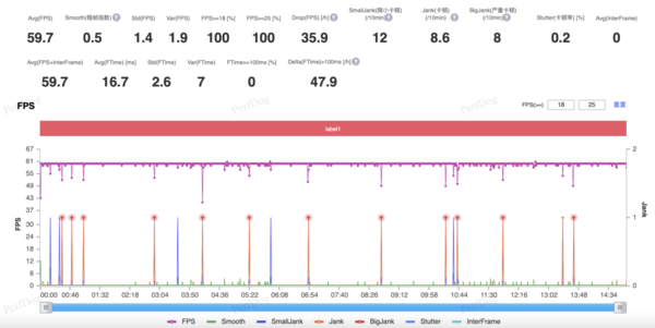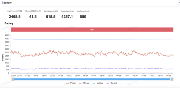 功耗方面,由于vivo采用雙電芯需要功耗x2,整個游戲過程中整機平均功耗為4.937W,在保持幾乎滿幀的前提下功耗還未超過5W,這樣的能耗比屬實不錯。