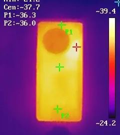 接著我們使用溫槍測量了vivo X90 Pro+的表面溫度,可以看到后背高溫的分布十分均勻,證明8900mm2的VC散熱面積確實還是非常有用的。