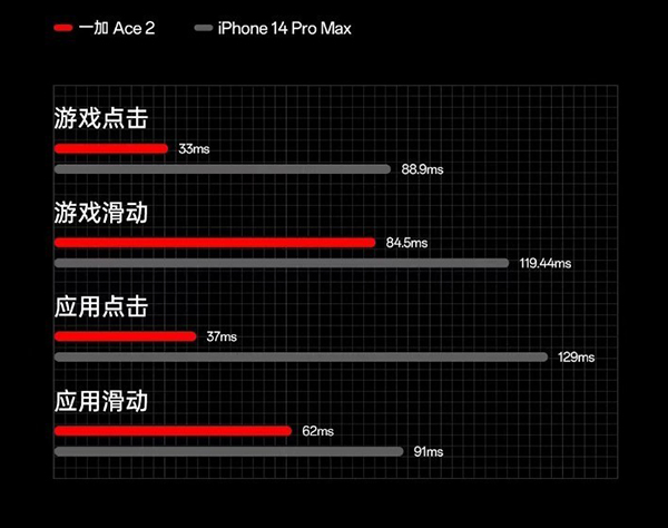 可能很多朋友還是沒看明白,這里我給大家舉個(gè)簡(jiǎn)單的例子。就以一加實(shí)驗(yàn)室的數(shù)據(jù)為例,在使用一加Ace2和iPhone14ProMax同時(shí)進(jìn)行《和平精英》游玩時(shí),在網(wǎng)絡(luò)環(huán)境、瞄準(zhǔn)位置、玩家反應(yīng)速度相同的情況下同時(shí)開槍,使用一加Ace2的玩家會(huì)更快完成開槍的動(dòng)作,從而在游戲中占據(jù)優(yōu)勢(shì)。