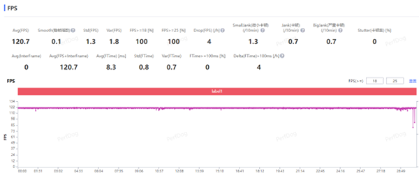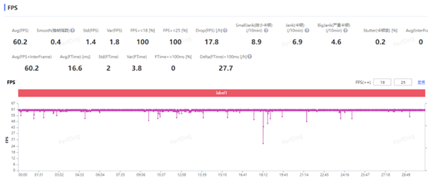 最后一項(xiàng)游戲測(cè)試,當(dāng)然是要留給《原神》。不同于各家對(duì)于《原神》游戲穩(wěn)定性的艱難挑戰(zhàn),一加是直接與《原神》達(dá)成了三年戰(zhàn)略合作,投入一億元成立了“一加-原神體驗(yàn)優(yōu)化實(shí)驗(yàn)室”,持續(xù)對(duì)《原神》的大版本更新做特別優(yōu)化。相較于其他手機(jī)廠商而言,一加手機(jī)在《原神》游戲穩(wěn)定性可以說(shuō)有“億點(diǎn)點(diǎn)”大。具體的數(shù)據(jù)表現(xiàn)如何,我們直接來(lái)看幀率圖吧。
