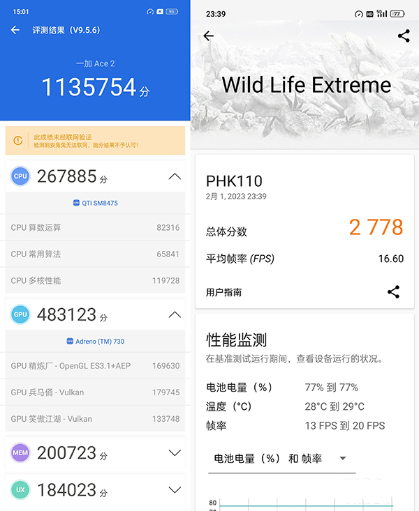 從跑分結(jié)果來(lái)看,一加Ace2安兔兔得分113萬(wàn),3DMarkWildLife Extreme得分2778,這樣的成績(jī)儼然已經(jīng)超過(guò)了很多搭載驍龍8+的專(zhuān)業(yè)游戲手機(jī),可見(jiàn)一加Ace2上的這顆滿血版驍龍8+在性能釋放上還是相當(dāng)激進(jìn)的。