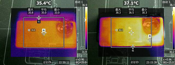 15分鐘安兔兔壓力測試前后的機(jī)身背部的溫度情況。