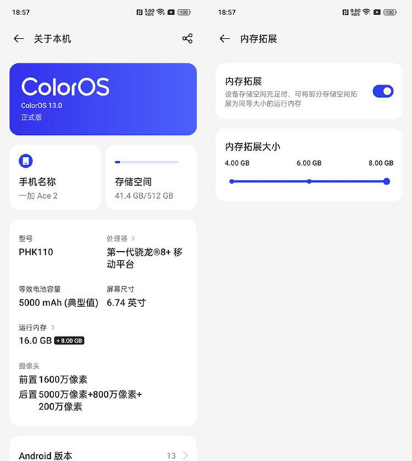 當(dāng)然,如果覺得16GB都還不夠滿足“掛機(jī)”的需求,那么一加Ace2還支持最高8GB的內(nèi)存擴(kuò)展。理論上,在滿血版旗艦SoC的支持下,它可以實(shí)現(xiàn)等效24GB的多任務(wù)運(yùn)行能力,而無需擔(dān)心因?yàn)镾oC算力不夠所導(dǎo)致的“殺后臺(tái)”問題。