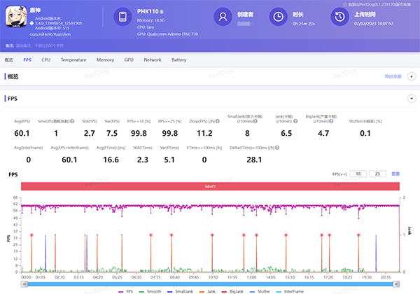 一加Ace2雖然沒用綜合表現(xiàn)更好的驍龍8Gen2,紙面性能會比一加11差點,但我跑了20分鐘最高畫質的原神試了一下,平均60.1幀(穩(wěn)幀指數(shù)1),也沒有肉眼可見的卡頓,要求再嚴苛應該也算「夠用」了吧?