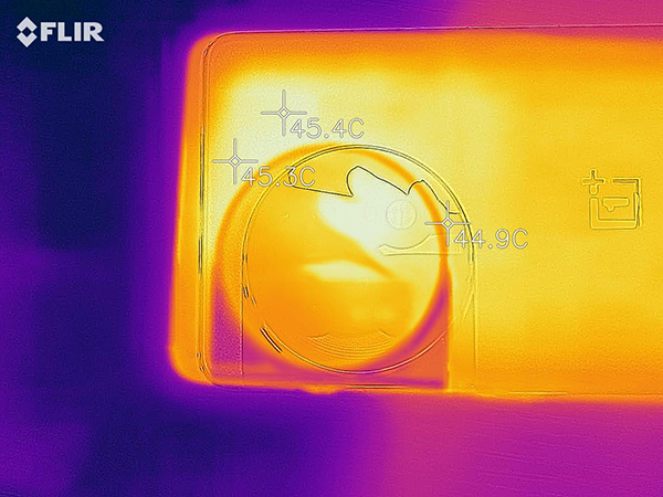 順手把溫度也測了,高溫按照慣例還是在攝像頭右側,最高45.4℃,還行。