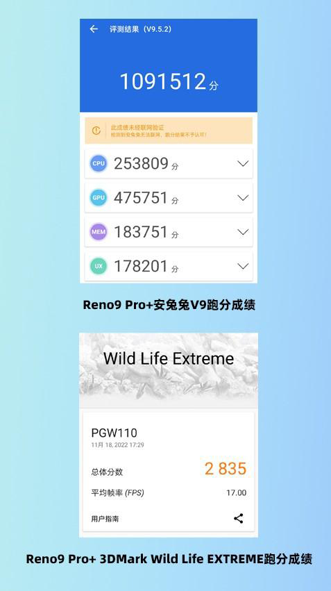 在大家熟悉的安兔兔V9跑分中,OPPO Reno9 Pro+取得了1091512分的優(yōu)異成績,并且在3DMark Wild Life EXTREME測試中也取得了2835分的優(yōu)秀成績,其性能表現(xiàn)相當亮眼,整體性能測試成績超越了大部分同價位機型。