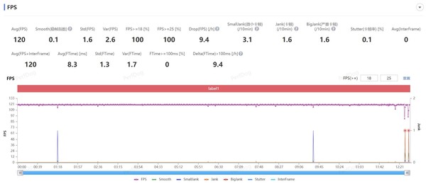 性能方面驍龍8+成為了全新的次旗艦產(chǎn)品,無(wú)論是性能還是成績(jī)都非常值得稱贊,那實(shí)際表現(xiàn)怎么樣,我們也為大家測(cè)試了真我GT Neo5的游戲幀率表現(xiàn),在開啟GT模式后,《王者榮耀》的平均幀率可以達(dá)到120幀,游戲幀率曲線平滑,即使是在一些需要高性能的5V5團(tuán)戰(zhàn)環(huán)節(jié),也并未出現(xiàn)明顯的幀率波動(dòng)。