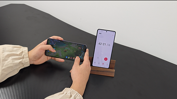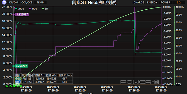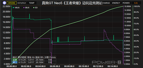 而在邊玩邊充的測試中,我們使用只有1%電量的GT Neo5一邊運(yùn)行《王者榮耀》一邊進(jìn)行充電,令人驚訝的是在前5分鐘的時間里,邊玩邊充的GT Neo5與此前一樣,均在5分鐘充電至60%左右,隨后充電功率稍稍降低,充電時間也稍有延長,但也在14分鐘左右顯示已充滿100%的電量(前臺充滿用時14分鐘,完全充滿用時15分鐘29秒)。