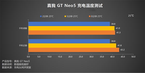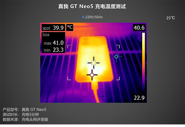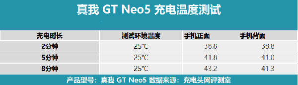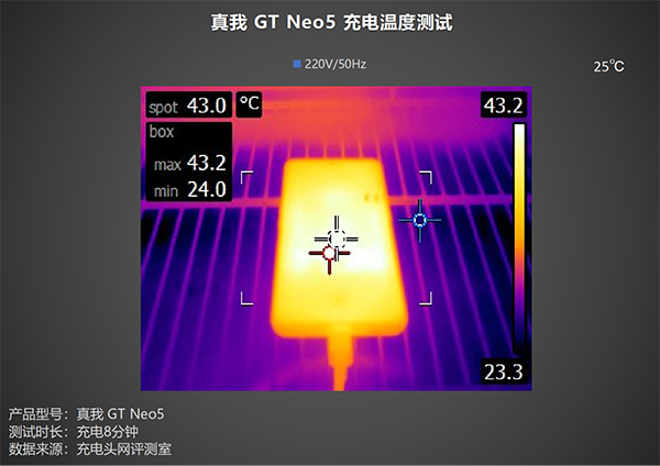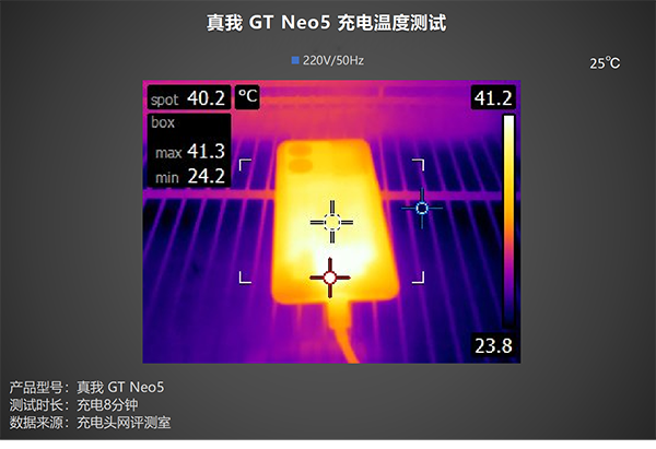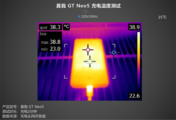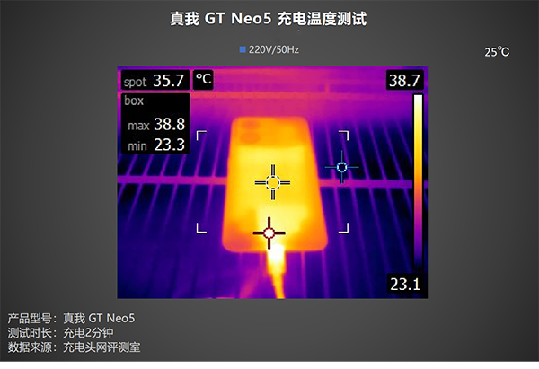 高功率充電時(shí),發(fā)熱便是我們所需要關(guān)注的一個(gè)問題,讓我們看看真我GT Neo5對(duì)于充電時(shí)溫度的調(diào)控如何,測試全程在25℃恒溫箱中進(jìn)行,溫度拍攝的時(shí)間點(diǎn)為:充電2分鐘、充電5分鐘、充電8分鐘。