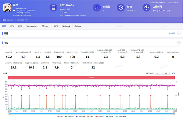 在實(shí)際游戲體驗(yàn)方面,榮耀80 GT運(yùn)行《原神》設(shè)置為最高畫質(zhì),游玩三十分鐘達(dá)到了平均幀率59.2幀的好成績。