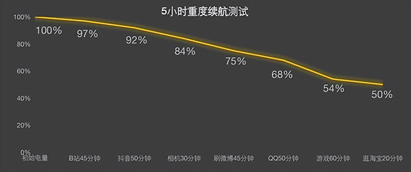 為了更直觀感受真我GT Neo5的續(xù)航表現(xiàn),筆者對(duì)其進(jìn)行了5小時(shí)重度續(xù)航測(cè)試,在當(dāng)前室溫環(huán)境下,連接辦公室Wi-Fi,關(guān)閉藍(lán)牙定位,屏幕亮度、音量均設(shè)為50%,其結(jié)果如下: