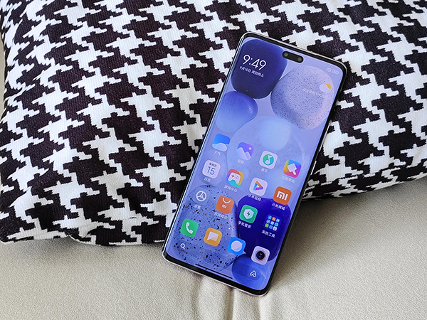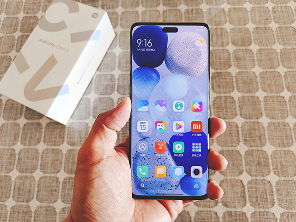 從正面來看,小米Civi2采用了藥丸形狀的挖孔設計,這個設計不禁讓我想起了蘋果iPhone14 Pro機型的靈動島,小米Civi2機型的靈動島也可以顯示應用程序信息。但不同于蘋果手機,小米Civi2采用了微曲面屏。
