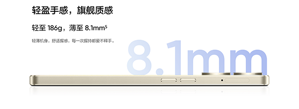 realme真我V30的顏值手感也是很亮眼的存在。該機采用了星砂幻彩設計,搭配漸變鍍膜,在有光線照耀的情況下,機身背部則可以呈現(xiàn)出非常璀璨奪目的光影色彩,配合光啞通體的設計語言,整機的質(zhì)感也是很獨特的。而擁有曙光金與夜闌黑兩款配色可選的真我V30,還將機身厚度控制在8.1mm,重量也僅約186g,相信喜歡輕薄機身手感的朋友一定會對它愛不釋手。