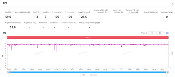 最后是重頭戲,原神手游開啟60幀+最高畫質(zhì)下,我們進行跑圖+打怪測試,經(jīng)過15分鐘的游戲,期間沒有出現(xiàn)大幅度波動與降幀,整體的幀率平均下來穩(wěn)定在了59.6FPS,接近滿幀運行。