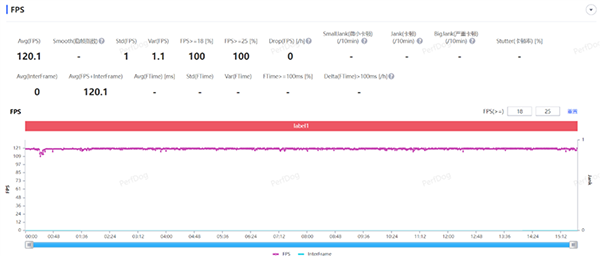 王者榮耀手游,在120幀畫面下支持超高分辨率與高清畫面的輸出,經(jīng)過一局團戰(zhàn)近15分鐘的測試,游戲起初稍有些波動,但后續(xù)的表現(xiàn)異常平穩(wěn),幀率維持在一條直線上,平均幀率達(dá)到120.1FPS,卡頓次數(shù)為0,這樣的幀率表現(xiàn)在所有驍龍8+的機型中可以排在前列。