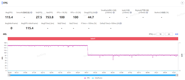 在整局游戲中,我們可以理解為,真我GT Neo5以半局游戲144幀、半局90幀的幀率運行,因此平均115.4FPS的成績相當(dāng)可以了。