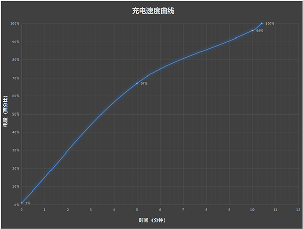 從1%開始進行滅屏充電測試,5分鐘充電至67%,10分鐘充電至96%,UI顯示完全充滿耗時10分40秒。