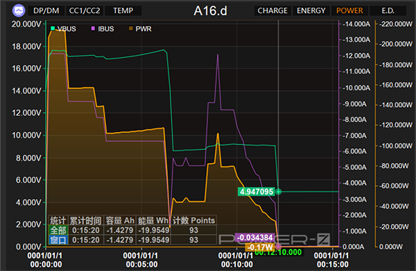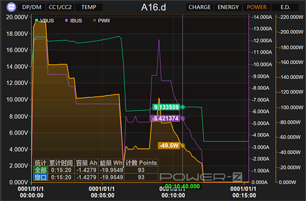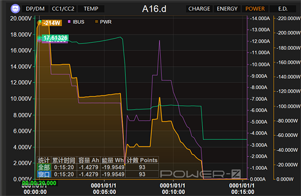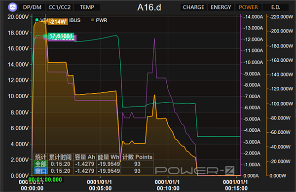 峰值功率214W,從20秒到1分鐘,持續(xù)近40秒的時間,而后降到156W左右的功率,而112W~117W的功率維持時間最長,達到了3分鐘,確保手機以最低的發(fā)熱量疾速回血。