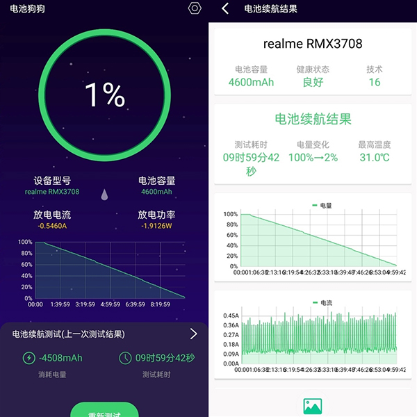 對于續(xù)航情況,我們使用專業(yè)續(xù)航測試工具——電池狗狗進行測試。